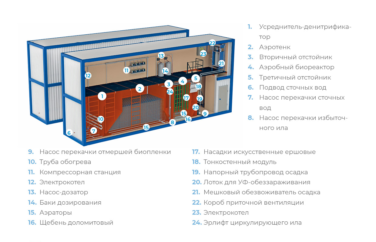 Возможно изготовление в корпоративных цветах Заказчика, нанесение фирменного логотипа. Для обеспечения подачи стоков на установку очистки в блочно-модульном исполнении рекомендуем предусмотреть КНС (подбор КНС по дополнительному запросу).
